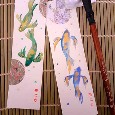 Tots els punts de llibre estan pintats a mà amb aquarel·la i tinta, sovint combinats amb papers especials per cada motiu.