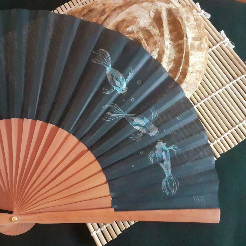 Todos los abanicos son de madera y tela y están pintados a mano con tintas y acuarelas, por tanto no deben mojarse, ya que se podrían deteriorar. Cada uno de ellos es único y personal.