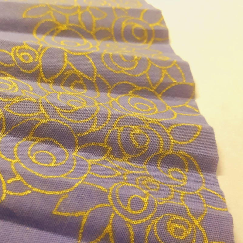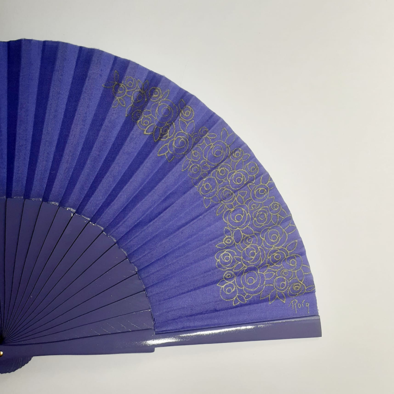Abanico pintado a mano de color violeta con color oro y madera pintada de abedul. Medida del abanico abierto 42 cm y cerrado 22 cm.
