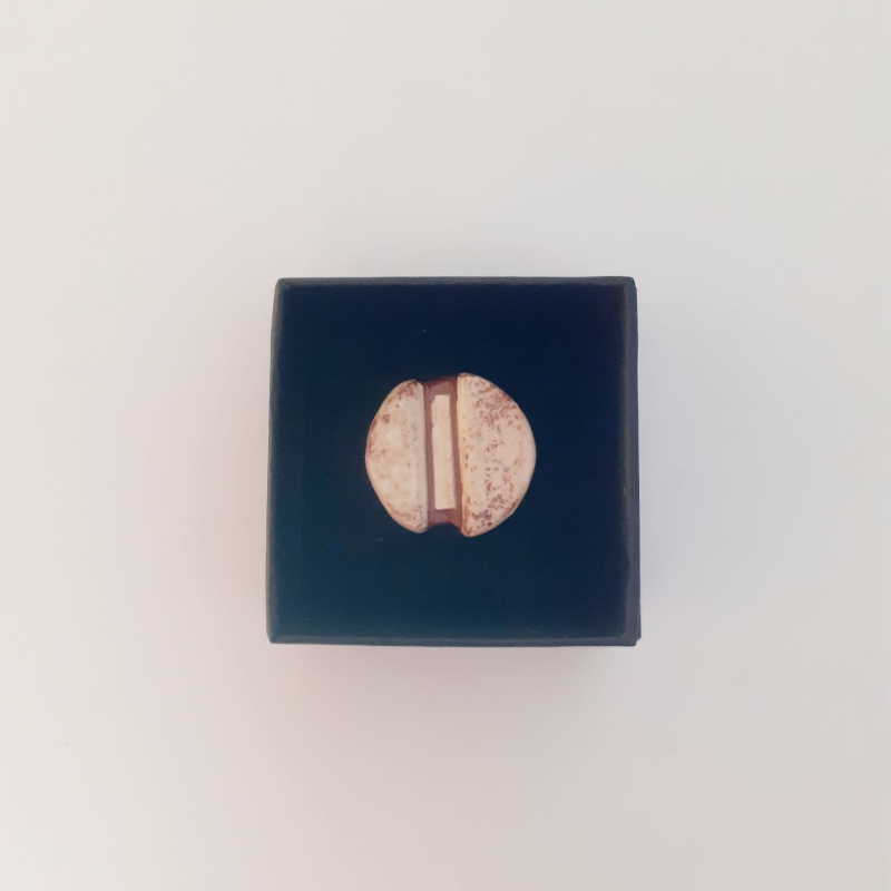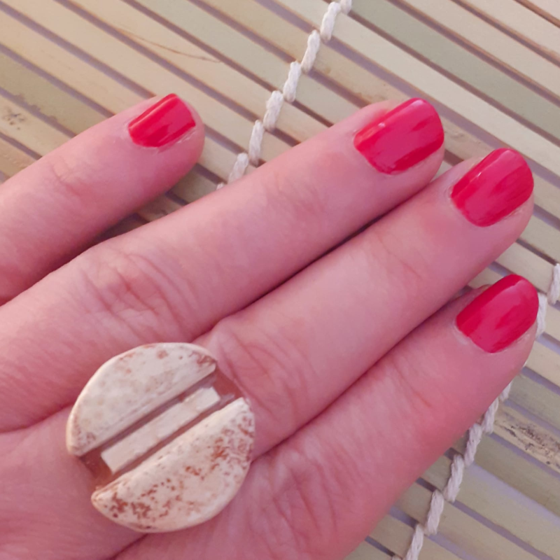 Realizo todos los anillos de cerámica artesanalmente, dependiendo del resultado que busco, uso una técnica u otra, las cocciones a 980C-1250C, dependiendo también de las materias utilizadas, las decoraciones están hechas con engobes, esmaltes y cristales. Las bases son ajustables y de plata. Son piezas delicadas, por lo que las disfruta mucho tiempo, cuida de ellas.