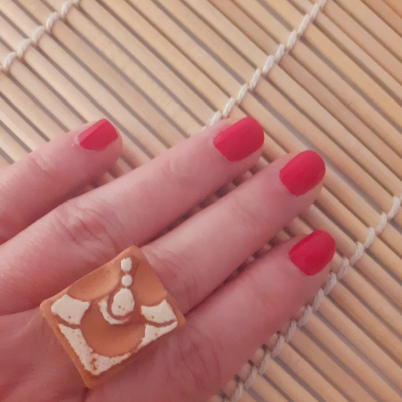 Realizo todos los anillos de cerámica artesanalmente, dependiendo del resultado que busco, uso una técnica u otra, las cocciones a 980C-1250C, dependiendo también de las materias utilizadas, las decoraciones están hechas con engobes, esmaltes y cristales. Las bases son ajustables y de plata. Son piezas delicadas, por lo que las disfruta mucho tiempo, cuida de ellas.