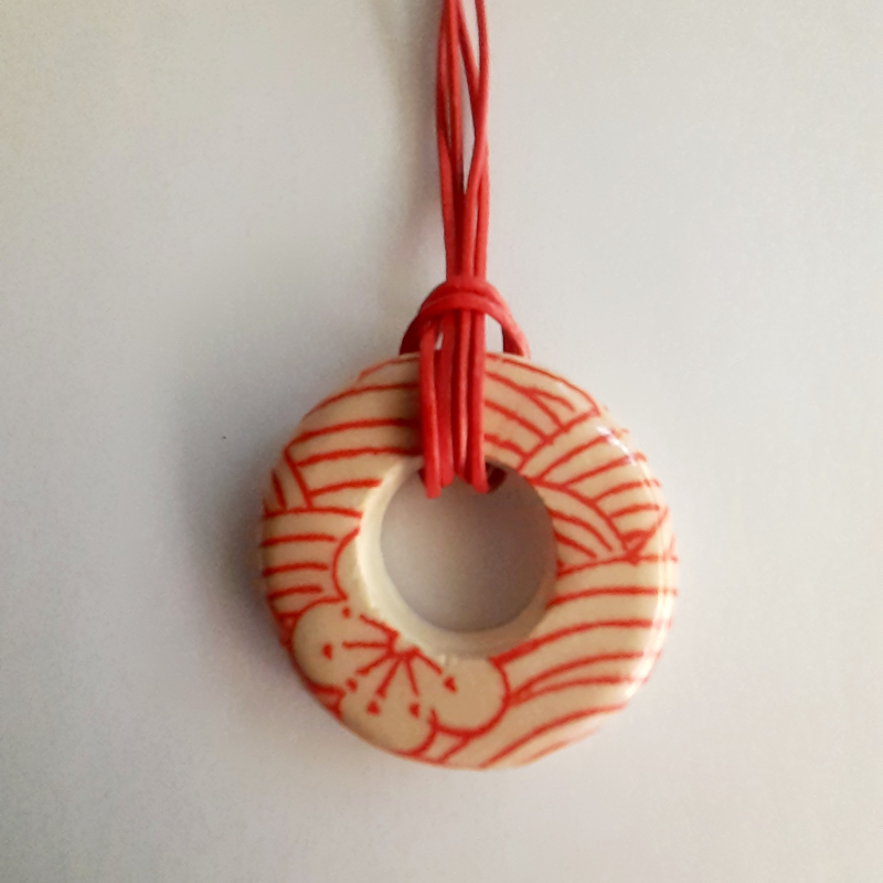 Colgante de cerámica decorada con cordoncillo doble de color crudo.