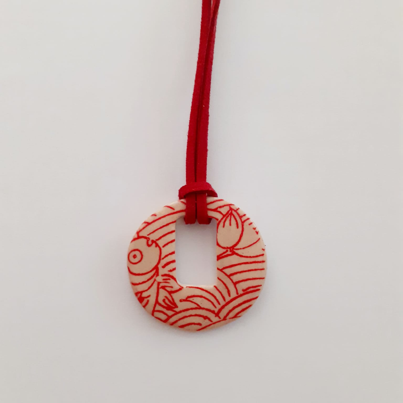 Colgante de cerámica blanca decorada con cordoncillo de cuero rojo.