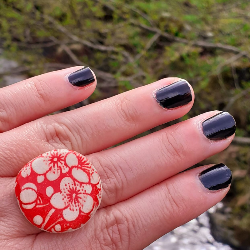 Realitzo tots els anells de ceràmica artesanalment, depenent del resultat que busco, faig servir una tècnica o altra, les coccions a 980C-1250C, depenent també de les matèries utilitzades, les decoracions estan fetes amb engalbes, esmalts i vidres. Les bases són ajustables i de plata. Són peces delicades, per tant que les gaudiu molt de temps, tingueu cura d’elles.