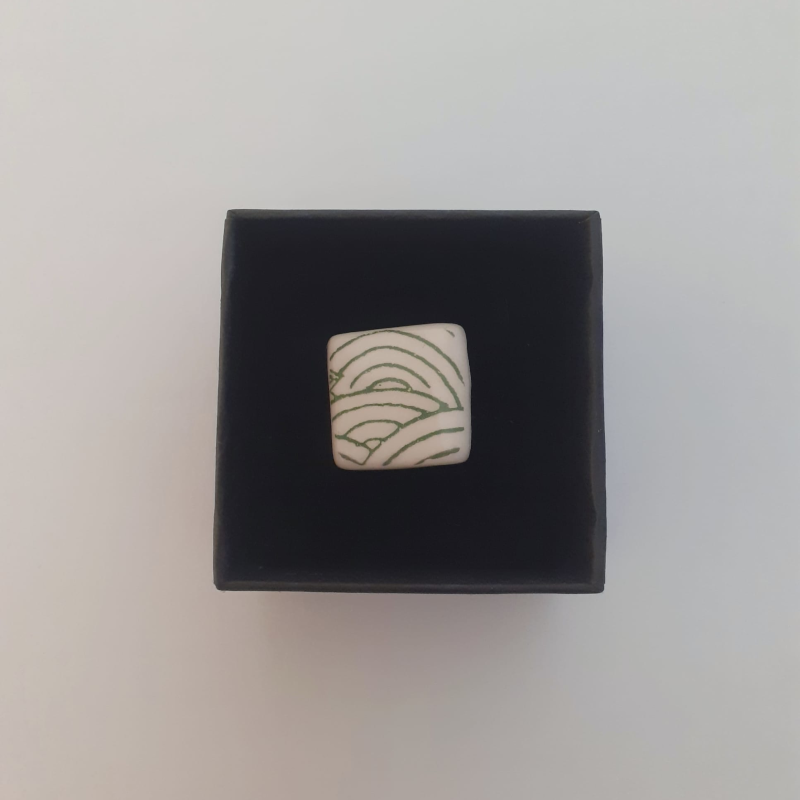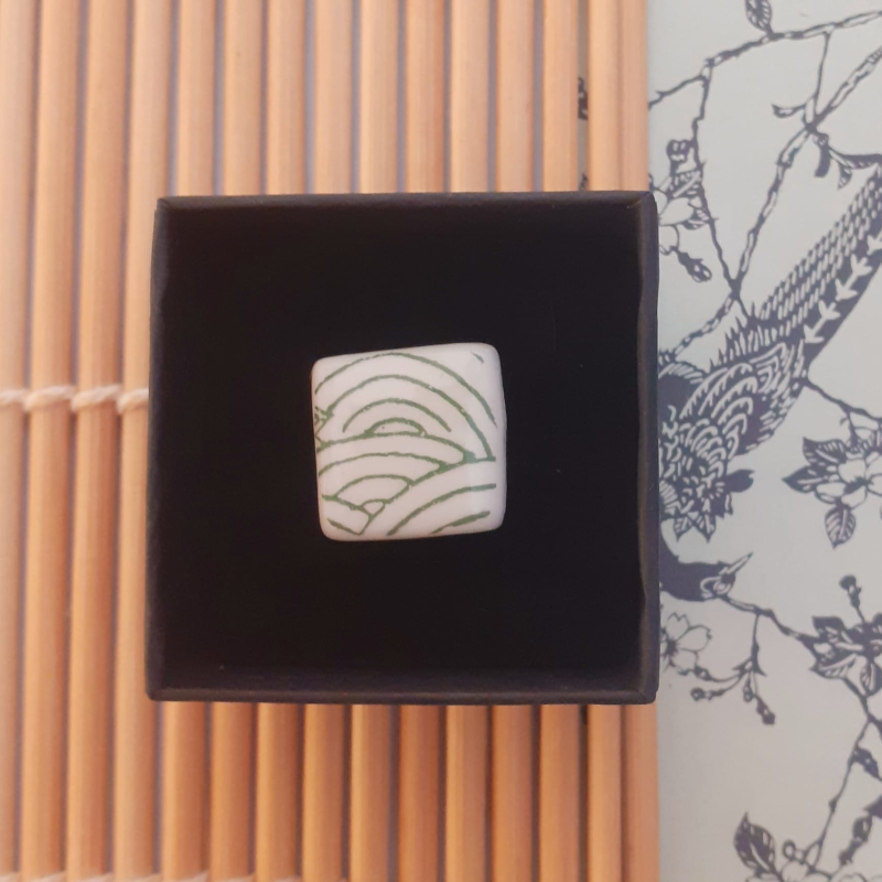 Anell cuadrat de ceràmica decorada amb base ajustable d’acer-inoxidable. Mida 2x2cm.