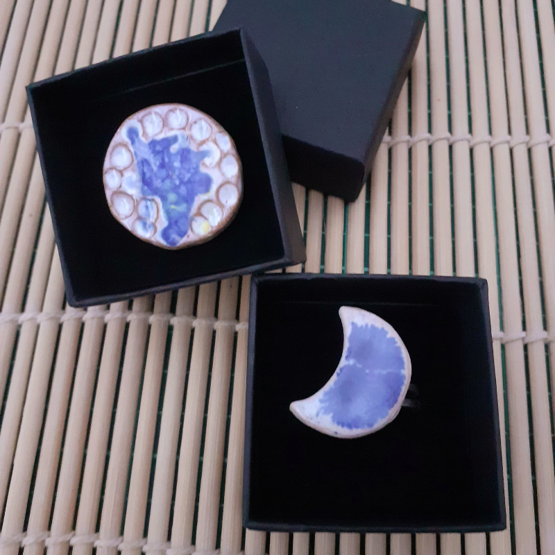 Realitzo tots els anells de ceràmica artesanalment, depenent del resultat que busco, faig servir una tècnica o altra, les coccions a 980C-1250C, depenent també de les matèries utilitzades, les decoracions estan fetes amb engalbes, esmalts i vidres. Les bases són ajustables i de plata. Són peces delicades, per tant que les gaudiu molt de temps, tingueu cura d’elles.