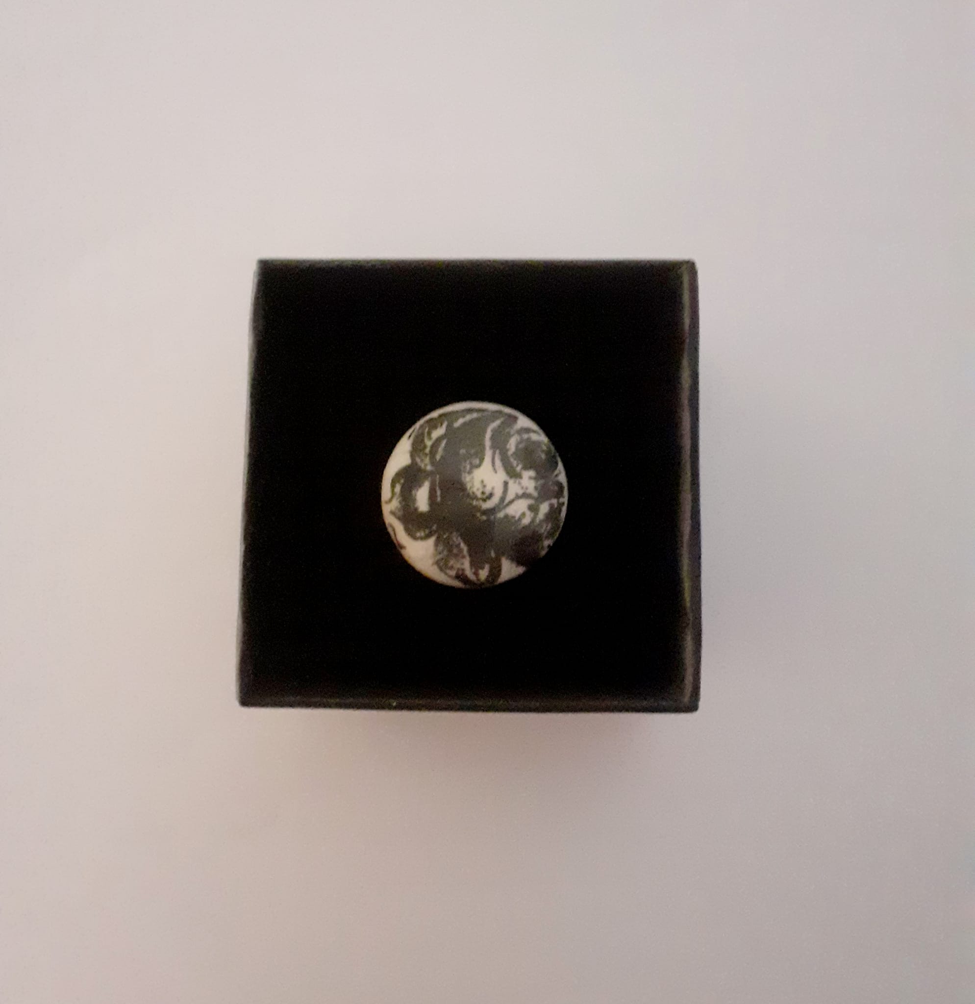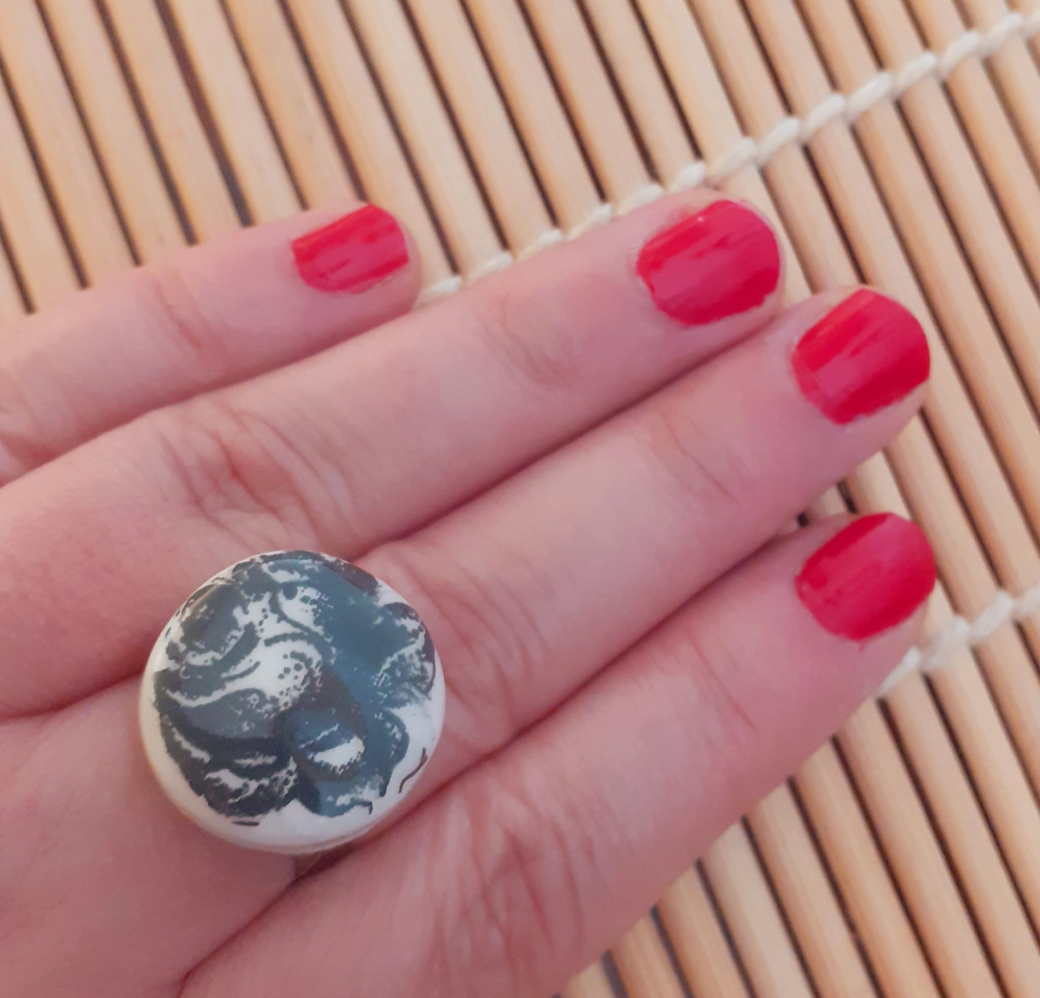 Anell de ceràmica decorat amb base ajustable d’acer inoxible. Mida 2 cm de diàmetre.