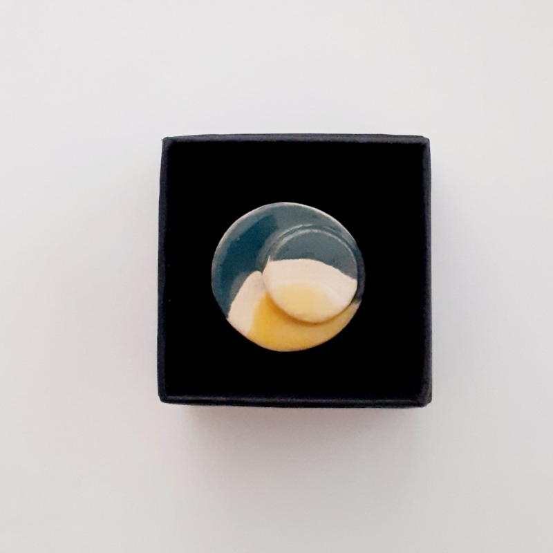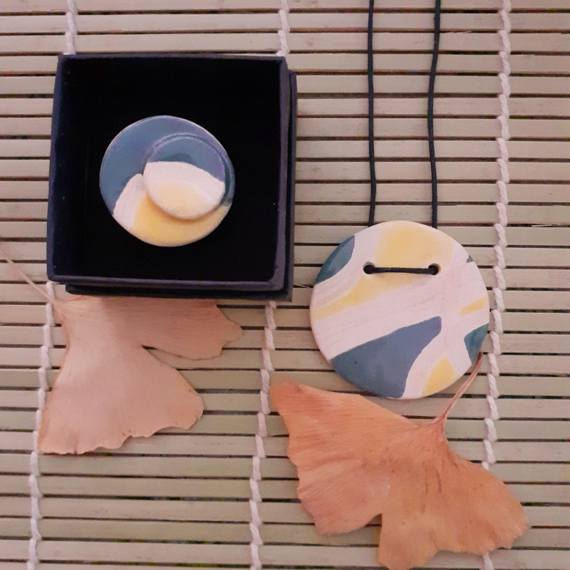 Anell de ceràmica blanca decorada amb esmalt i reserva de cera i base ajustable de plata. Mida 3 cm de diàmetre. Te penjoll a joc.