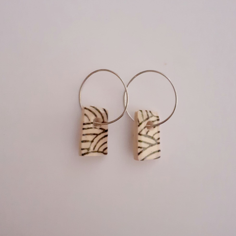 Arracades de ceràmica blanca decorades i cèrcols platejats. Mida 1,5×1 cm.