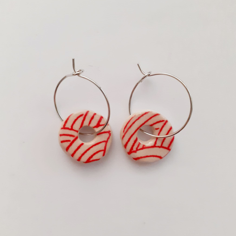 Arracades de ceràmica blanca decorades i cèrcols platejats. Mida 1,5 cm.