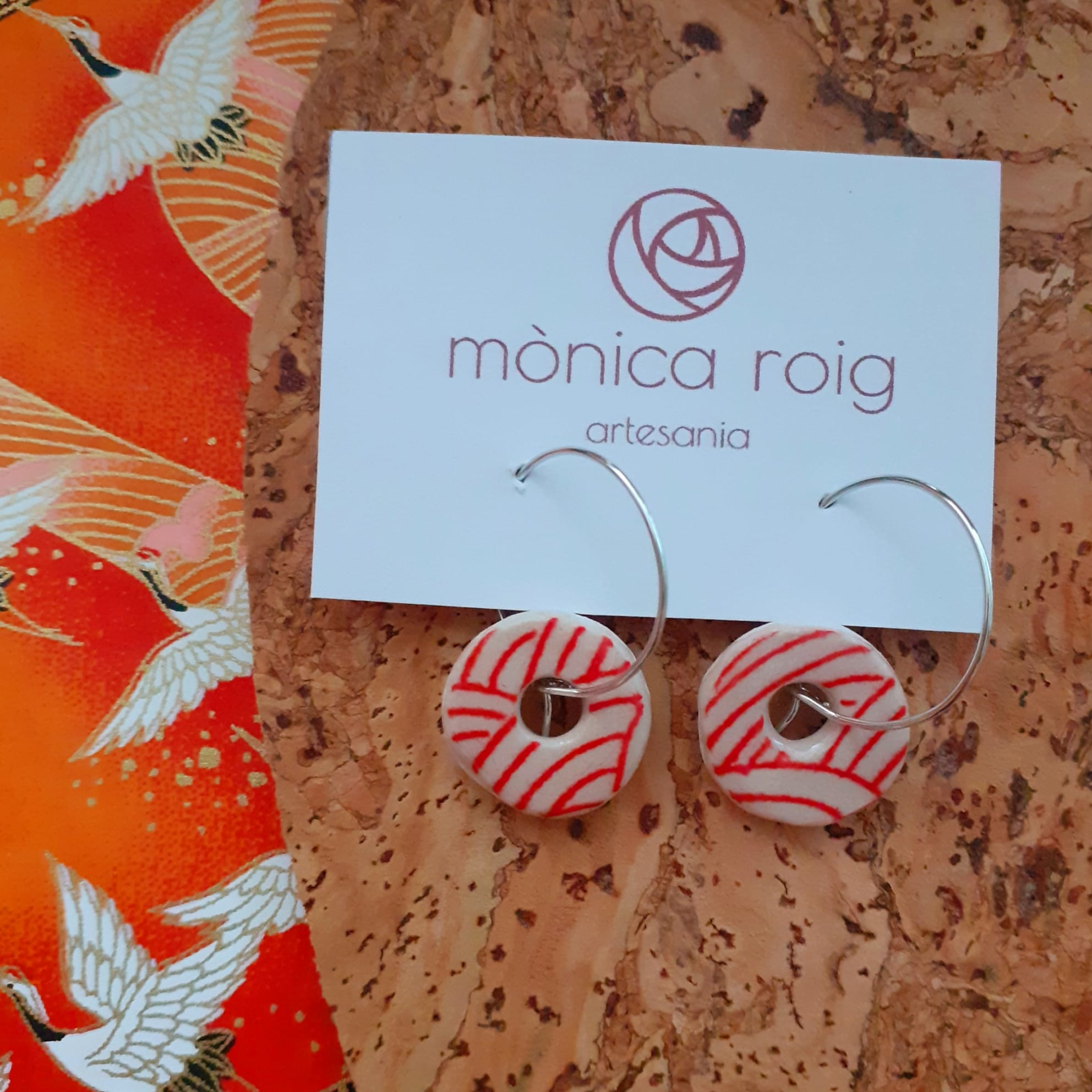 Realitzo totes les arracades de ceràmica artesanalment, depenent del resultat que busco, faig servir una tècnica o altra, les coccions a 980C-1250C, depenent també de les matèries utilitzades, les decoracions estan fetes amb engalbes, esmalts i vidres. Les tanques són de plata, per tant de no produir cap al·lèrgia. Són peces delicades, per tant que les gaudiu molt de temps, tingueu cura d’elles.