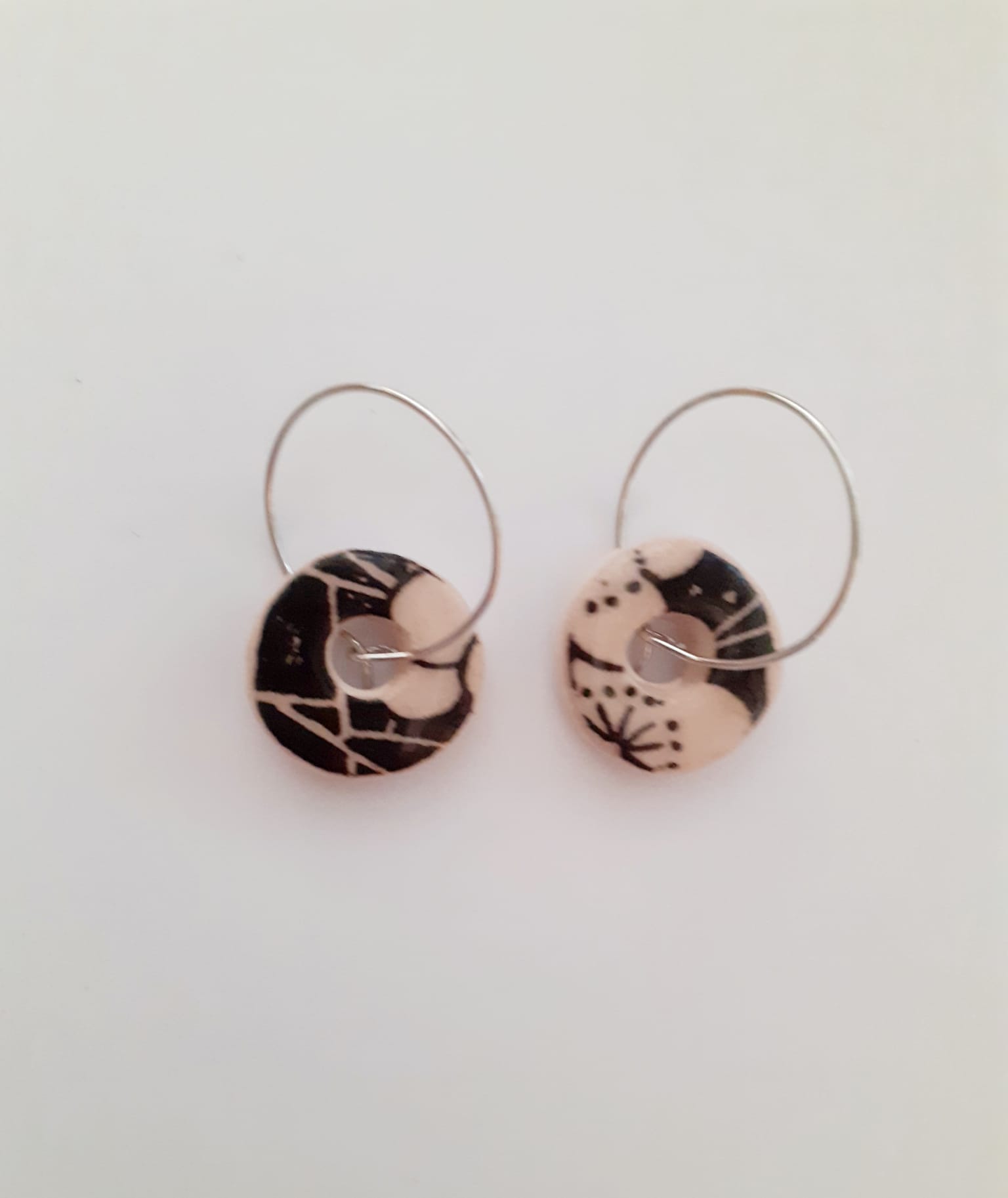 Arracades de ceràmica blanca decorades amb cèrcols platejats. Mida 1,5 cm.