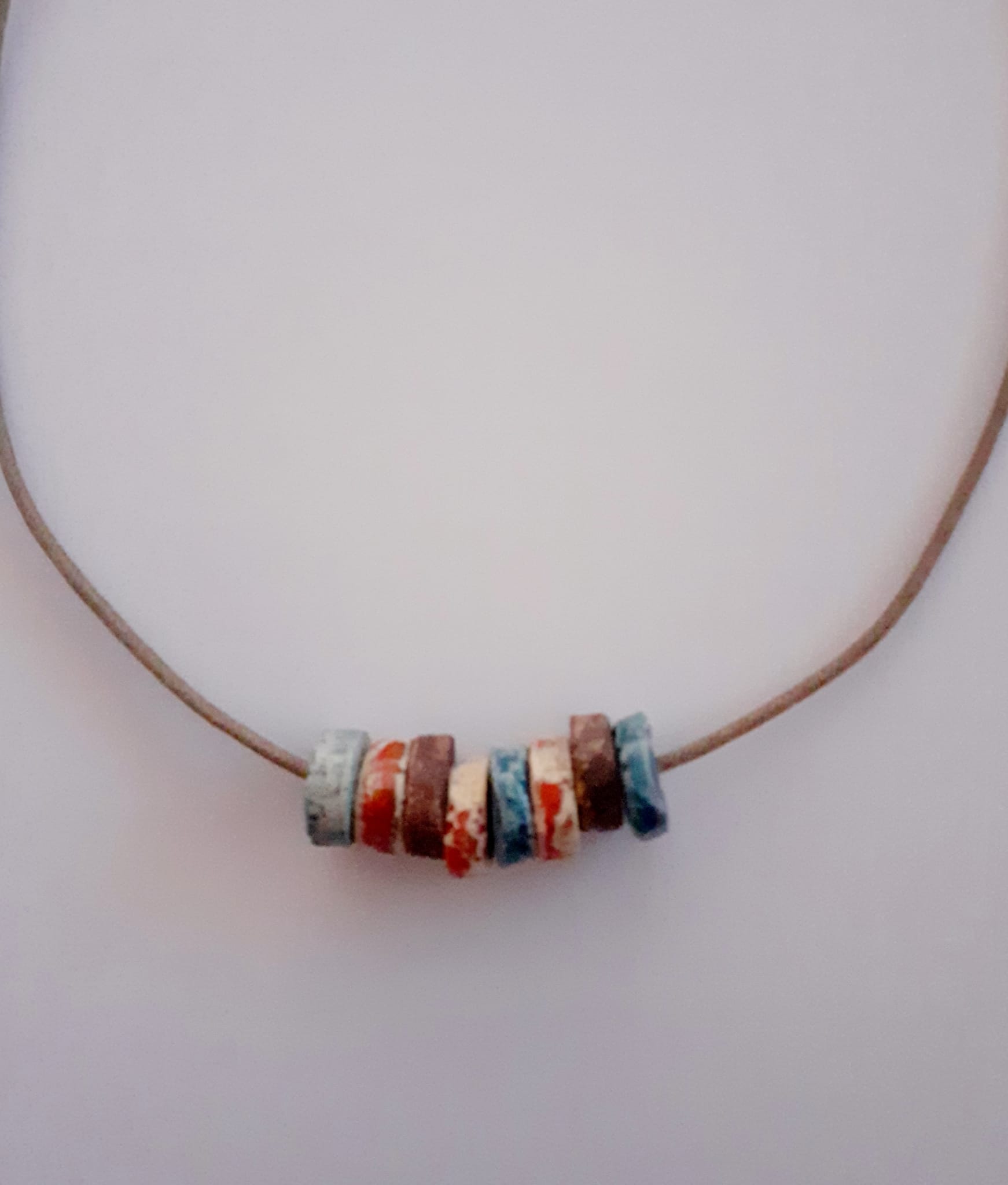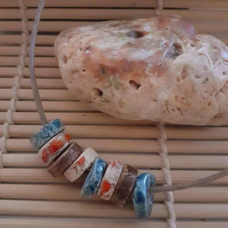Tots els collars i penjolls de ceràmica estan fets artesanalment, depenent del resultat que busco, faig servir una tècnica o altra, les coccions a 980C-1250C, depenent també de les matèries utilitzades, les decoracions estan fetes amb engalbes, esmalts i vidres. Estan muntats en cordonets de cuir o metall i totes les peces són úniques. Un bon complement pel teu vestuari.