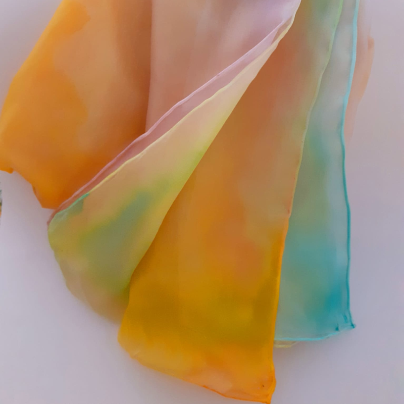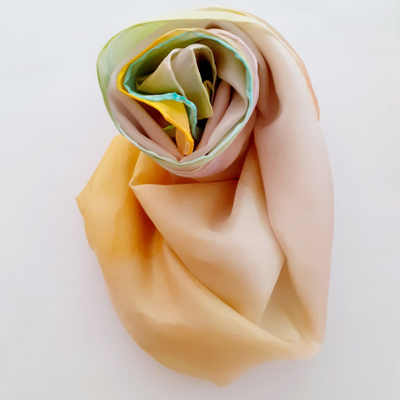 Els mocadors i fulards de seda, són tots pintats a mà amb tintes tèxtils i diverses tècniques, això fa que tots siguin diferents i personals.