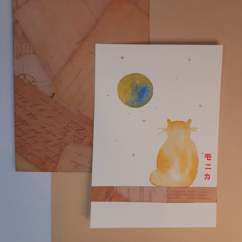 Postal pintada a mà amb  aquarel·la, gouache i collage. Va presentat amb sobre a joc fet a mà.