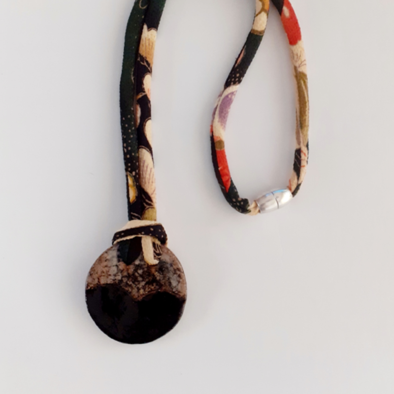 Penjoll de ceràmica amb decoració d’esmalt i cinta de tela estampada.
