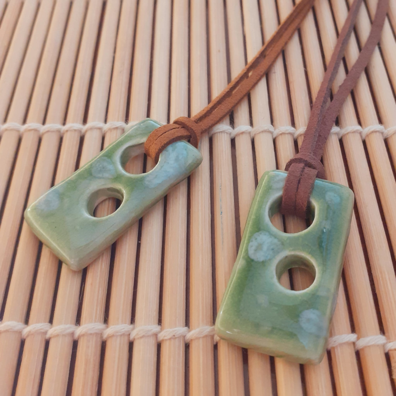 Tots els collars i penjolls de ceràmica estan fets artesanalment, depenent del resultat que busco, faig servir una tècnica o altra, les coccions a 980C-1250C, depenent també de les matèries utilitzades, les decoracions estan fetes amb engalbes, esmalts i vidres. Estan muntats en cordonets de cuir o metall i totes les peces són úniques. Un bon complement pel teu vestuari.
