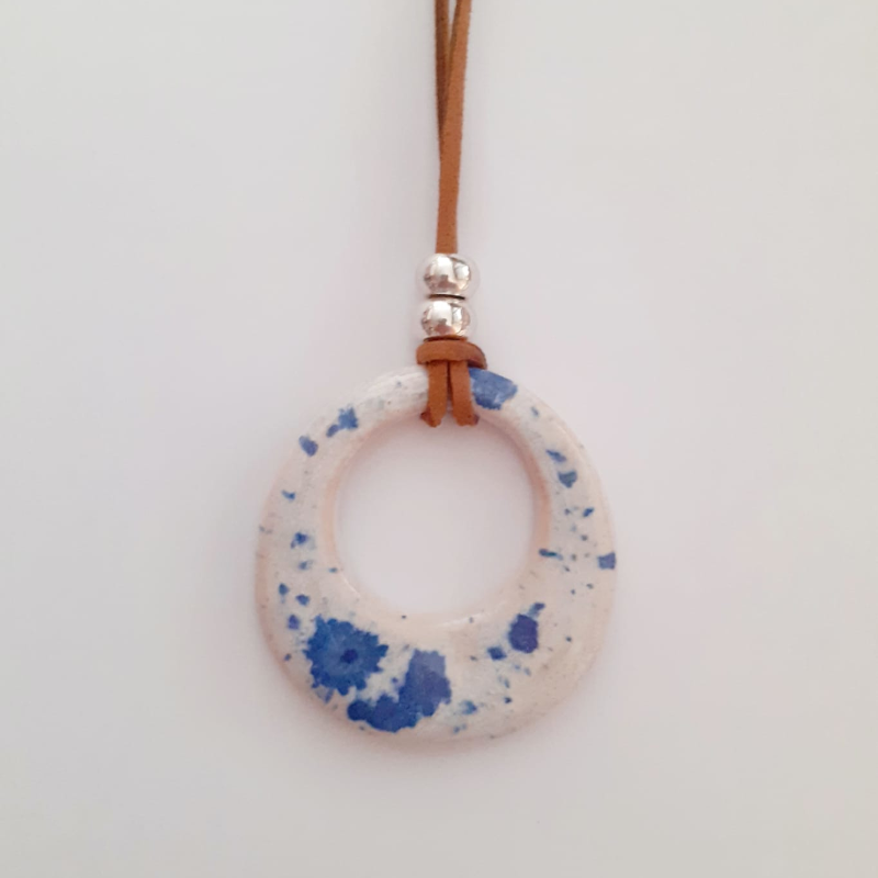 Penjoll llarg de ceràmica blanca decorat amb esmalt i cordonet marró ajustable. Mida 5 cm diàmetre.