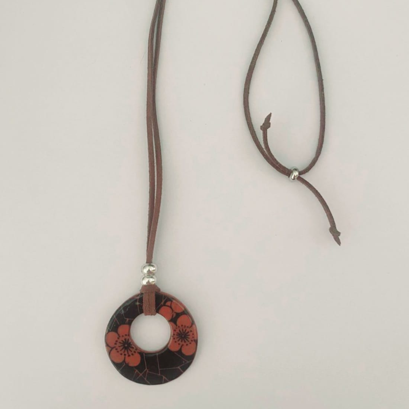 Penjoll llarg de ceràmica  decorada amb cordonet de cuir ajustable i boletes platejades. Mida 4,5cm de diàmetre. Anell i arracades a joc.