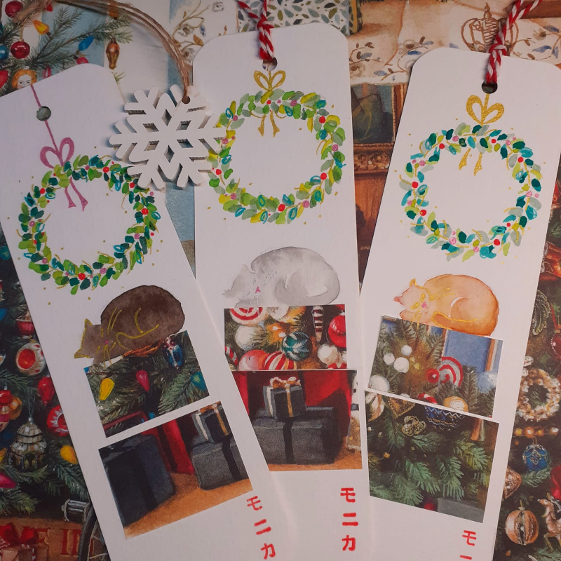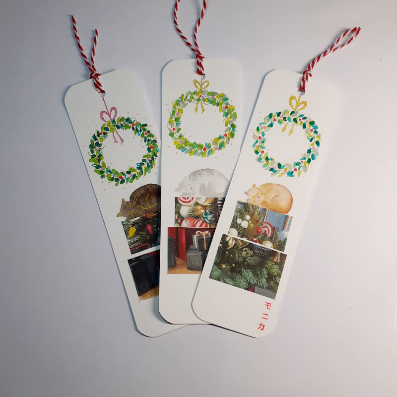 Tots els punts de llibre estan pintats a mà amb aquarel·la i tinta, sovint combinats amb papers especials per cada motiu. També els faig sobre comanda.