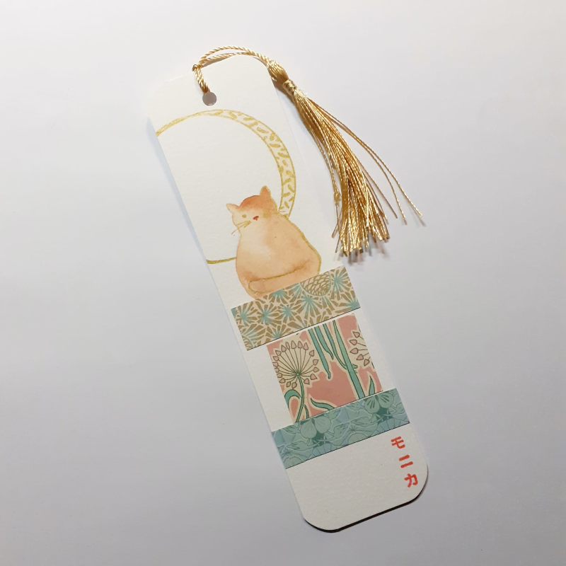 Punt de llibre pintat a mà amb aquarel·la i collage i borla daurada. Tots els punts de llibre van amb la seva funda de paper.