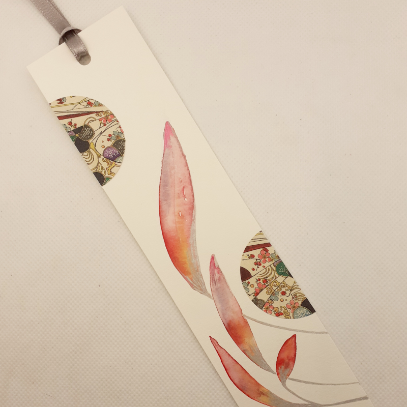 Punts de llibre pintats amb aquarel·la i paper japonès i cinteta de tela.
