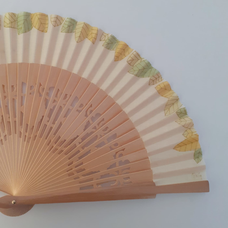 Ventall de color natural pintat a mà i barnillatge de bedoll. Mida del ventall obert 43 cm i tancat 23 cm.