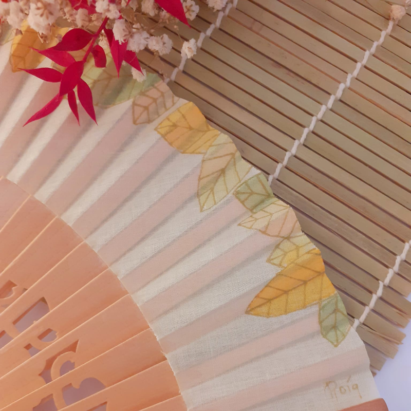 Tots els ventalls són de fusta i tela, estan pintats a mà amb tintes i aquarel·les, per tant no s’han de mullar, ja que es podrien deteriorar. Cada un d’ells són únics i personals.