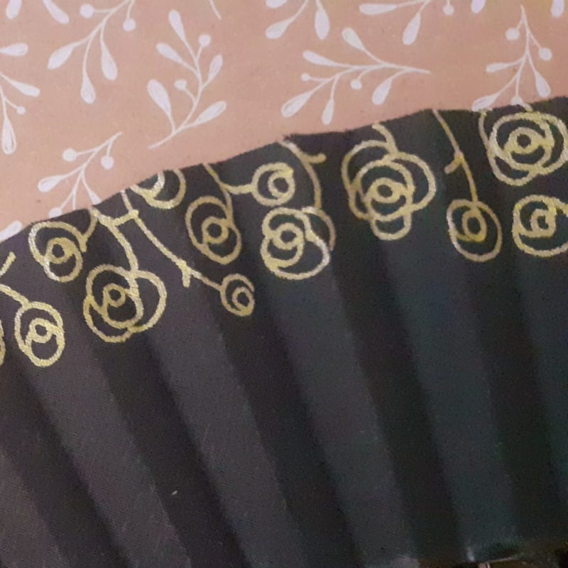 Ventall  de color negre pintat a mà  amb roses daurades i barnillatge de bedoll. Mida del ventall obert 43 cm i tancat 23 cm.