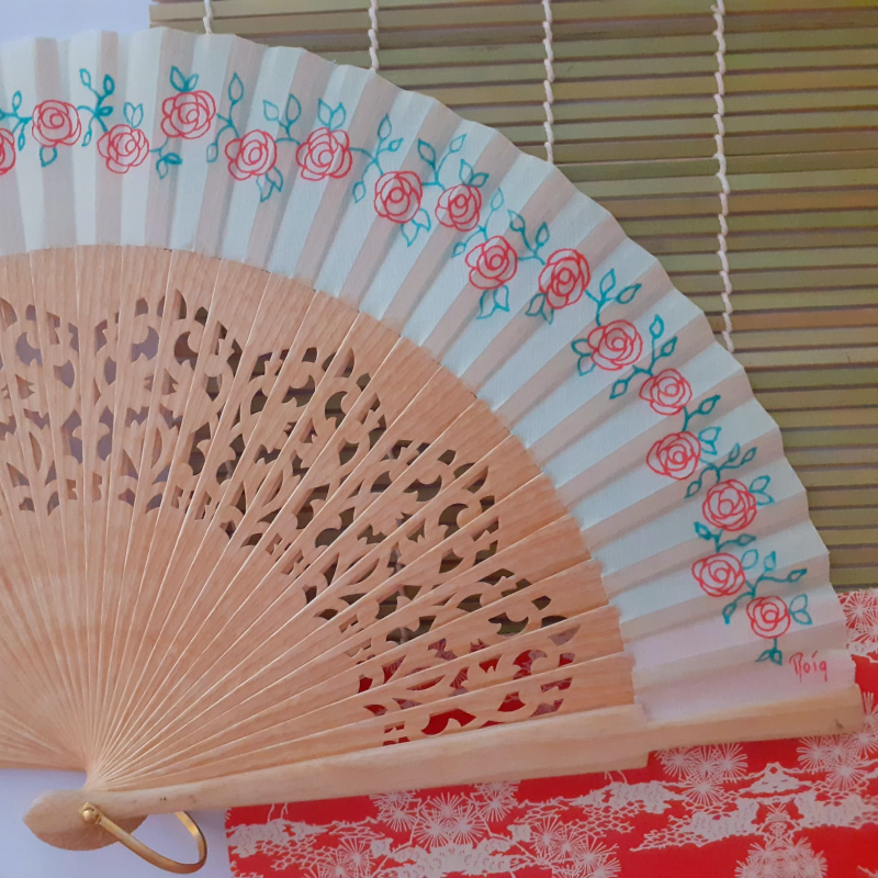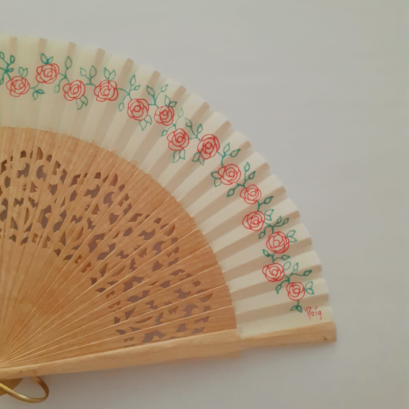 Tots els ventalls són de fusta i tela, estan pintats a mà amb tintes i aquarel·les, per tant no s’han de mullar, ja que es podrien deteriorar. Cada un d’ells són únics i personals.