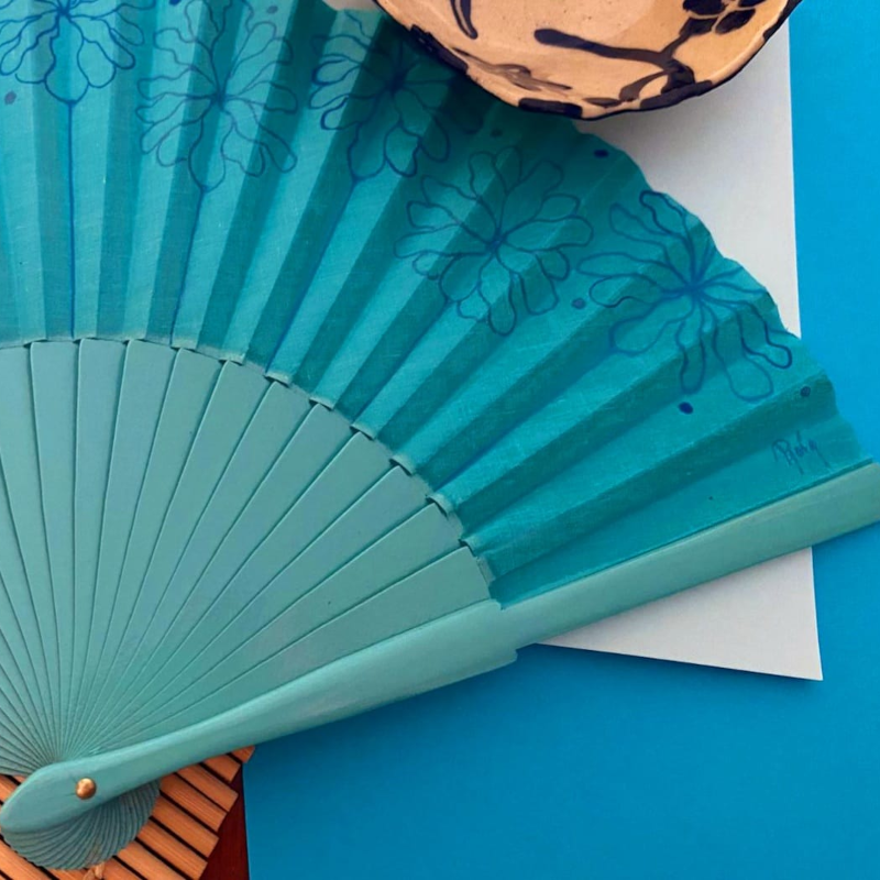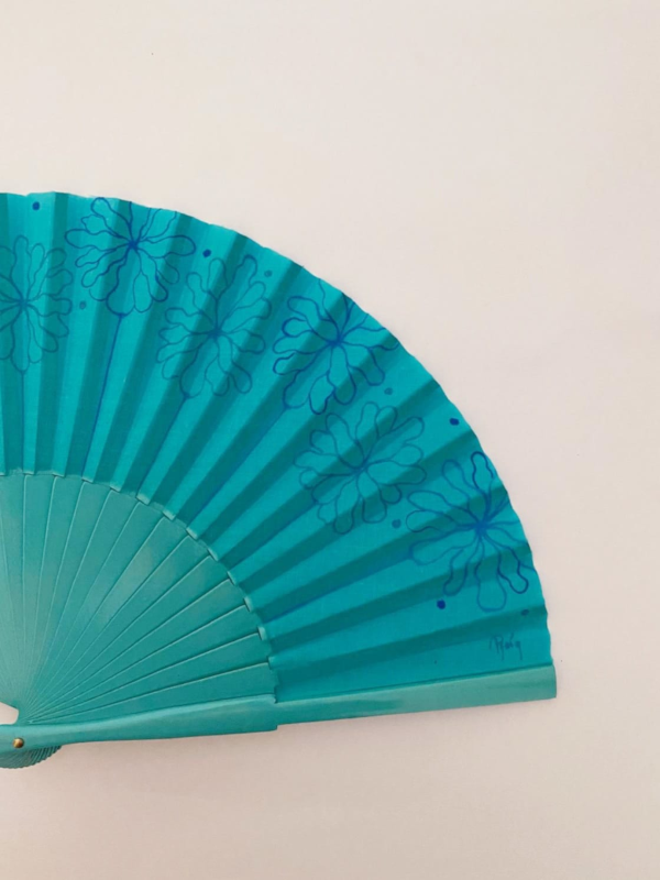 Tots els ventalls són de fusta i tela, estan pintats a mà amb tintes i aquarel·les, per tant no s’han de mullar, ja que es podrien deteriorar. Cada un d’ells són únics i personals.