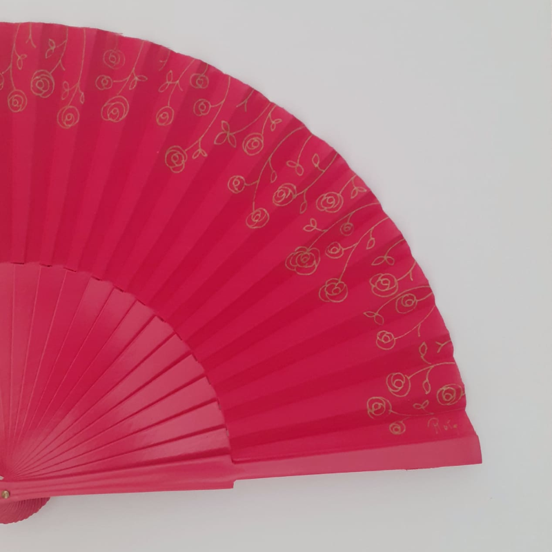 Ventall pintat a mà de color fucsia amb barnillatge de fusta de perer pintat Mides del ventall obert 43 cm, tancat 23 cm.