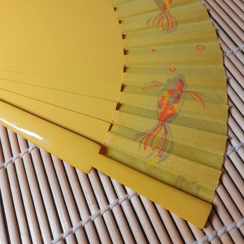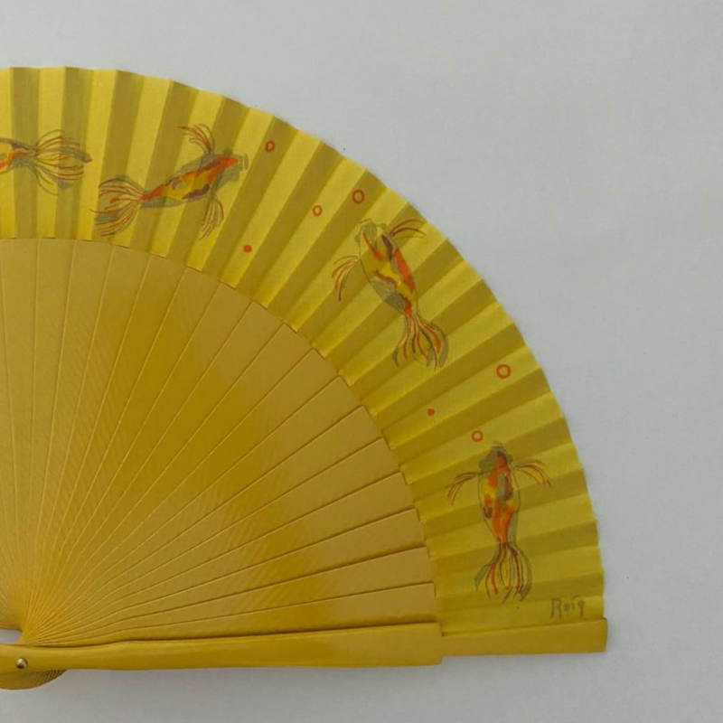 Ventall pintat a mà de color groc i barnillatge de bedoll pintat. Mida del ventall obert 42 cm i tancat 22 cm.