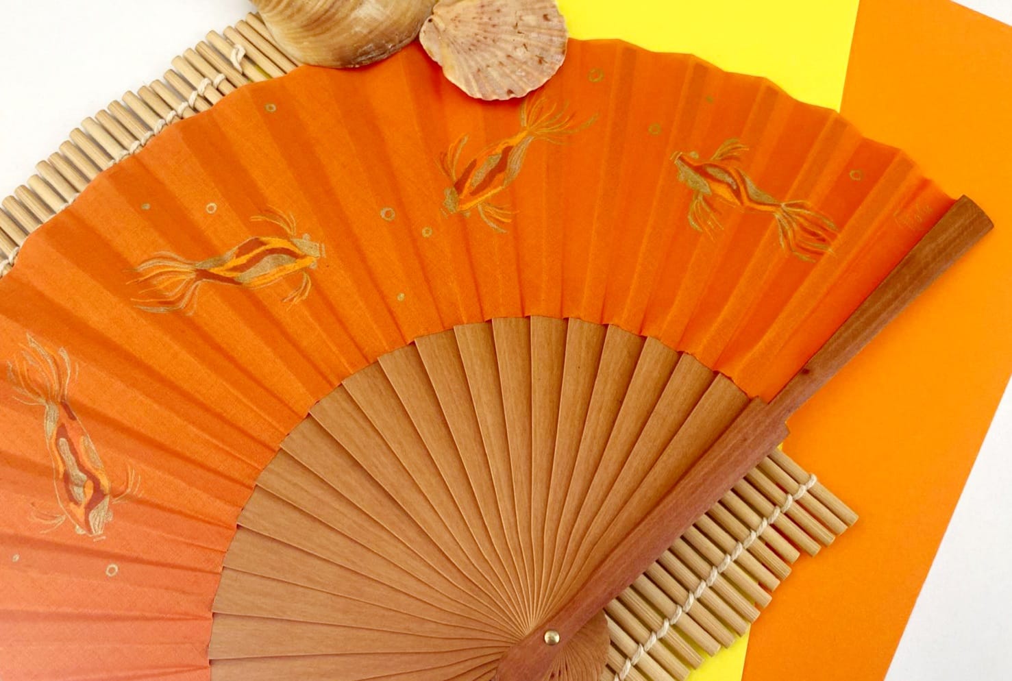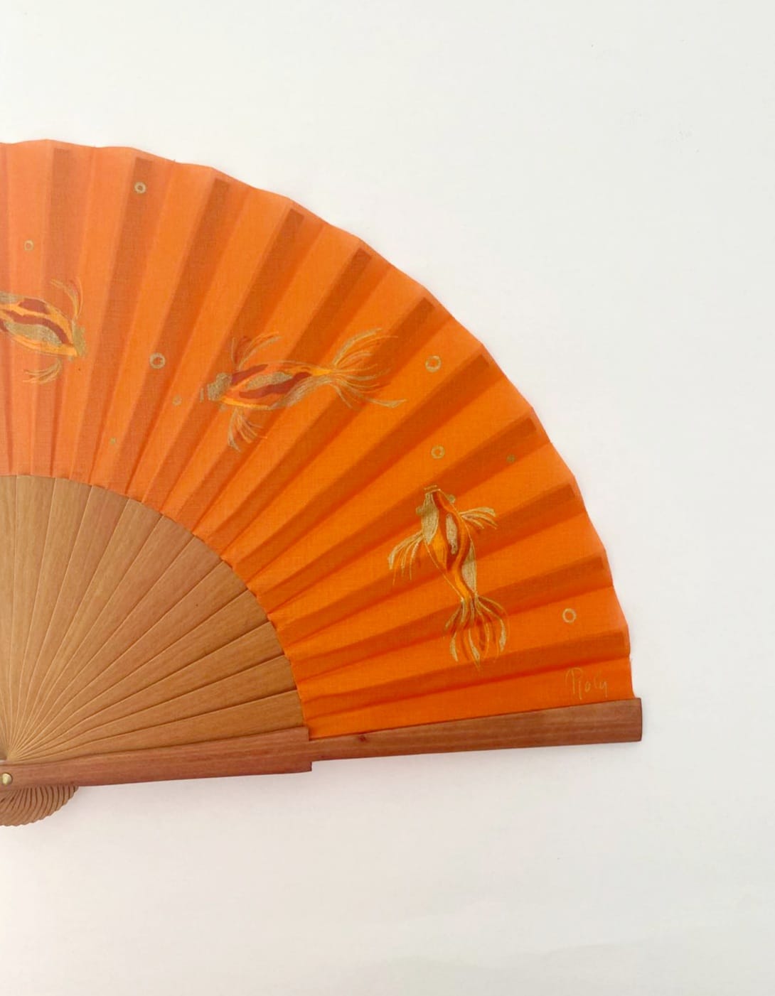 Ventall pintat a mà de color taronja amb barnillatge de perer. Mida del ventall obert 42 cm i tancat 22 cm.