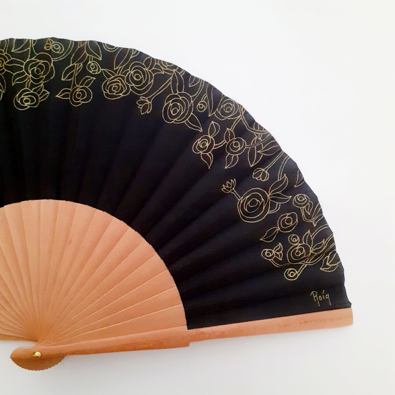 Tots els ventalls són de fusta i tela, estan pintats a mà amb tintes i aquarel·les, per tant no s’han de mullar, ja que es podrien deteriorar. Cada un d’ells són únics i personals.