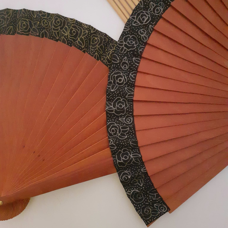Tots els ventalls són de fusta i tela, estan pintats a mà amb tintes i aquarel·les, per tant no s’han de mullar, ja que es podrien deteriorar. Cada un d’ells són únics i personals.