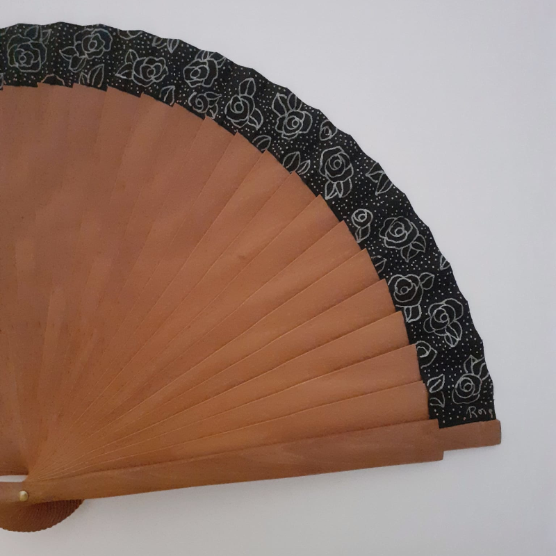Ventall de mida mitjana de color negre pintat a mà i barnillatge de fusta de perer pulida. Mida del ventall obert 37cm i tancat 21cm.